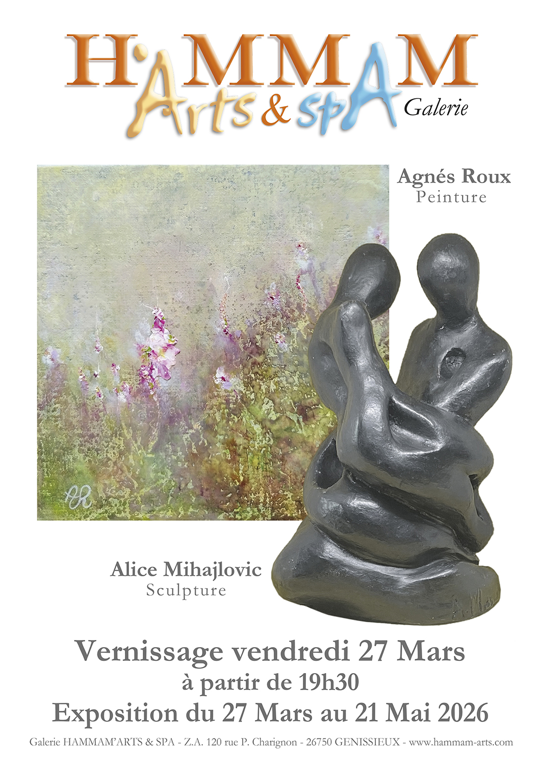 En effet HAMMAM ARTS GALERIE aura le plaisir de vous présenter deux artistes: Agnès Roux (peintre) et Alice Mihajlovic (Sculptrice)